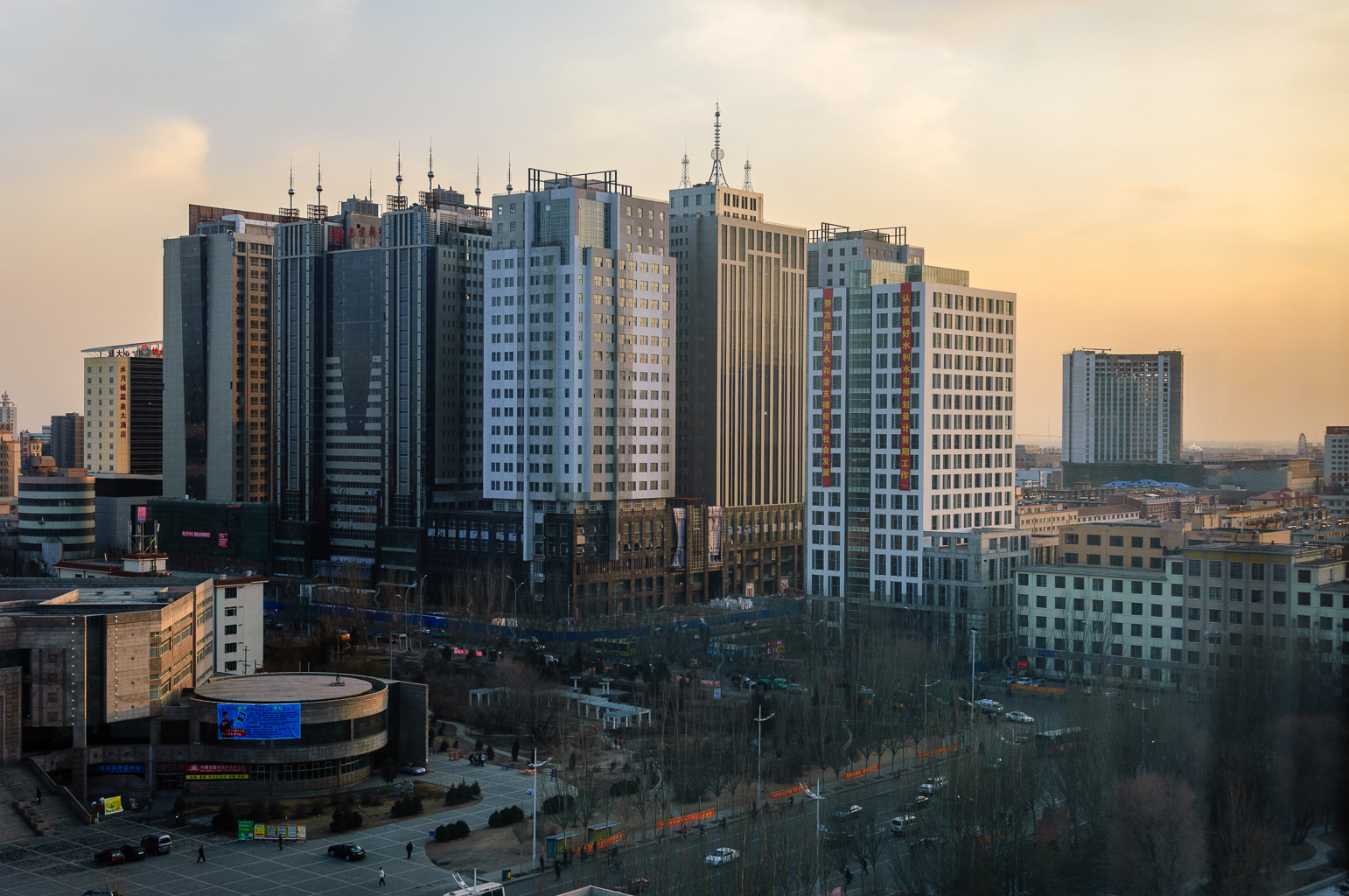 Il n'est que 6h et il fait déjà nuit. Inutile de penser aller faire un tour dehors, d'ailleurs nos hôtes nous fixent rendez vous à 7h pour aller dîner. La ville est immense, les rues ont six voies pour les voitures et une pour le vélo. Partour de constructions, nous roulons roulons, vers où? J'ai peu à peu l'impression que la densité d'immeuble diminue. Et si nous n'allions pas dîner en ville mais à la campagne? Cette fois nous avons quitté la ville, la route ressemble plus aux routes indiennes, c'est à dire à un chemin de terre touts juste carossable. Je me prends à rêver d'un diner sous une yourte. Cette fois il n'y aplus rien que la steppe éclairée pas les phares du 4x4 et juste sur le côté deux yourtes. Bingos! Ma joie et de courte durée, à l'image du désapointement de nos hôtes. C'est fermé! La voiture roule à nouveau. Peu à peu la lumière revient, les voies s'élargissent, nous sommes de retour en ville. Soudain nous prenons au travers d'un parc et stoppons. Tout autour de mois des petites yourtes... en bétons! Il s'agit d'un restaurant et chaque fausse yourte est un salon privé où l'on peut tenir à huits personnes environs. Sitôt la porte refermée une chaleur toute relative nous enveloppe.